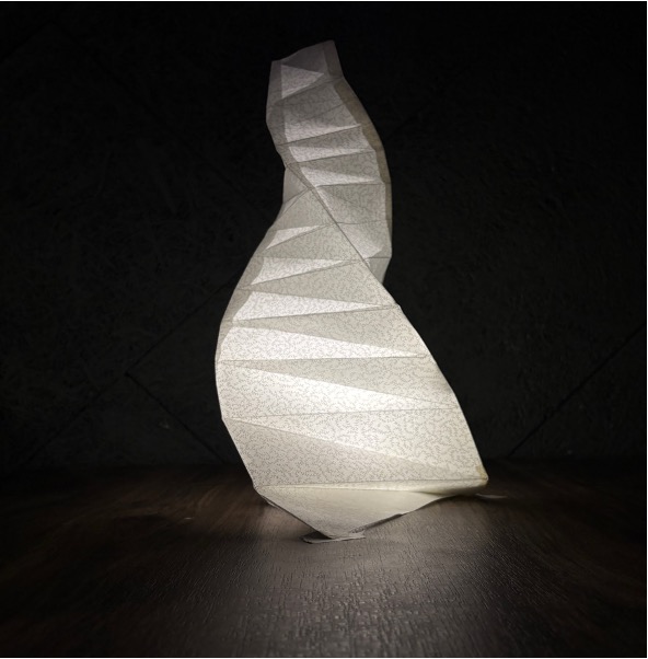 無盡的螺旋結構在皺摺的堆疊中向上延展,如同人成長的軌跡,每一道摺痕都是經歷的印記,堆疊出此刻的自己。作品的尺度、色溫、亮度可靈活轉化,作為檯燈或地景燈展現其光影層次間的流動感。
