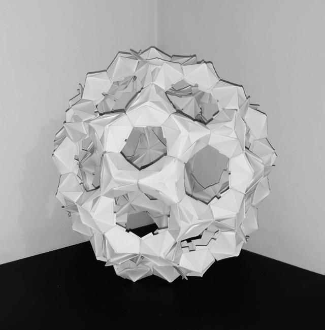 以碳分子 C₆₀ 的結構為靈感,將六十個摺紙單元組合成截角二十面體。簍空的造型使光線自由穿梭於其間,隨時間投射出不同的光影。每一單元如同花朵綻放,象徵靈感與創意的萌發與流動。